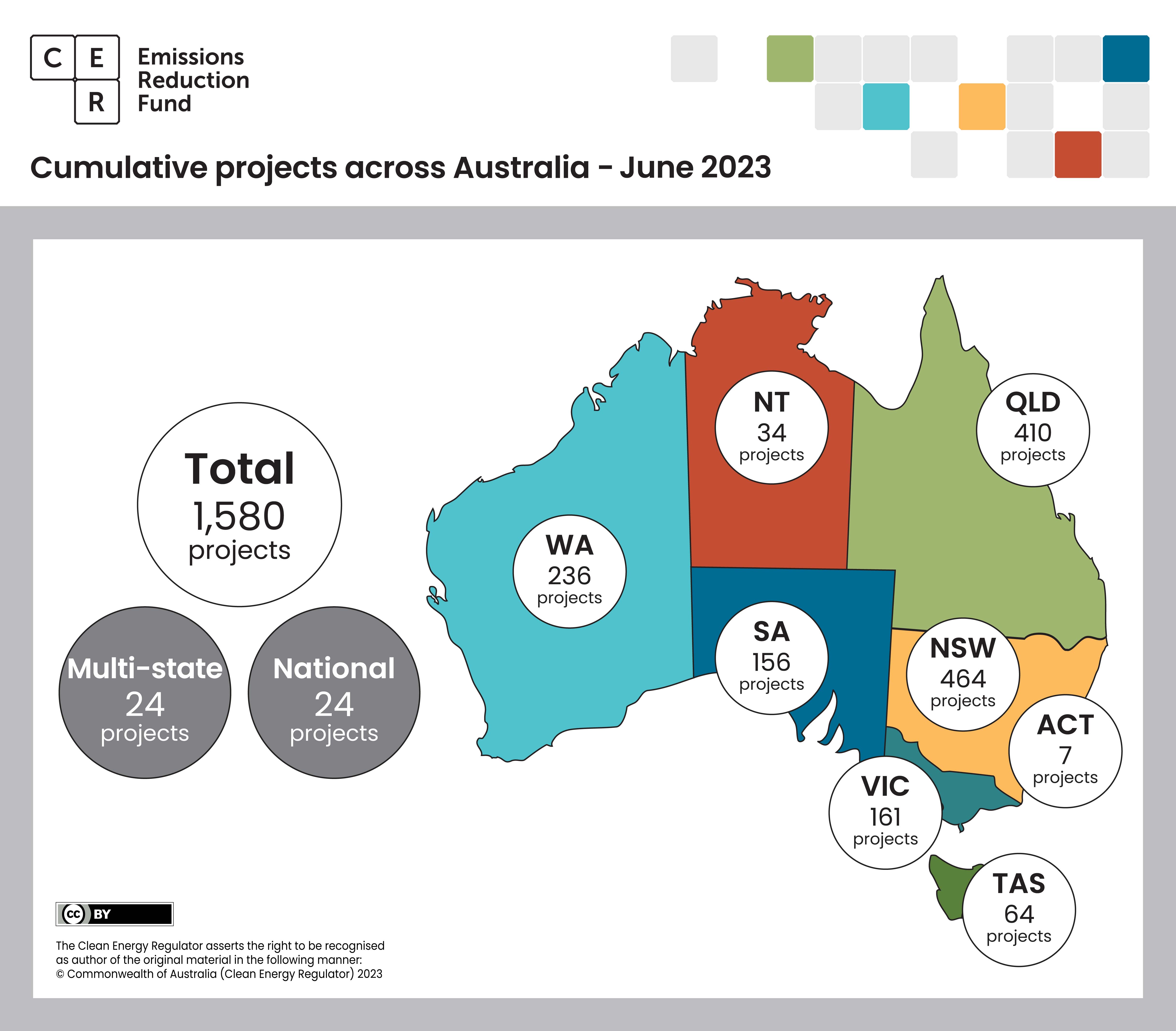 This map shows the cumulative total number of Emissions Reduction Fund projects registered in each state and territory across Australia, as at 30 June 2023. The below data does not include information on revoked projects. Data from revoked projects is available in the Emissions Reduction Fund project register.
